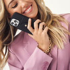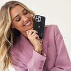Features an anti-shock leather phone case with wallet, and matching leather phone strap, paired with a luxe gold-plated phone wristlet / bracelet.