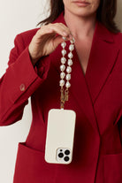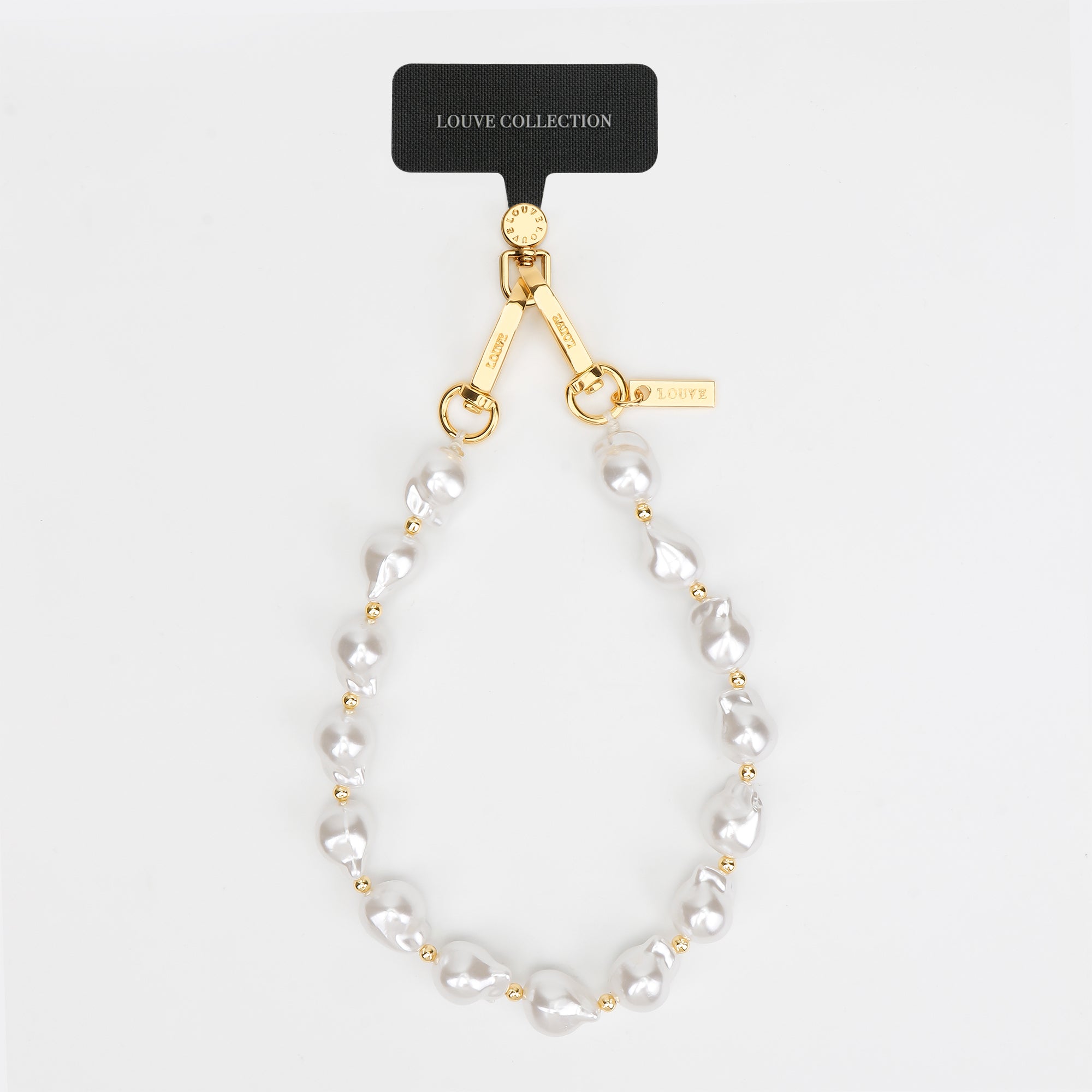 The Universal Phone Strap Connector easily slides through the opening of most non-LOUVE phone cases, allowing you to attach straps and wristlets for crossbody, wrist or neck wear. Paired with the Daisy Pearl Wristlet—featuring off-white faux pearls and gold-toned hardware—this bundle brings a luxurious, feminine touch to your smartphone setup.